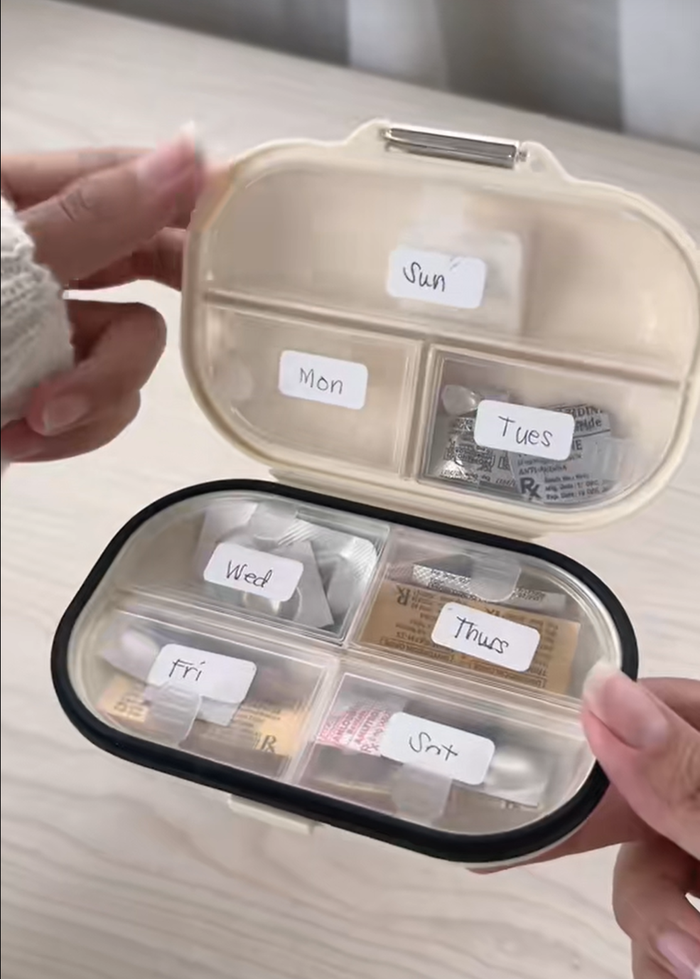 يأتي مع ملصقات لتحديد الوقت، اليوم، ونوع الدواء أو الفيتامين في كل خانة، مما يسهل عليك متابعة جدولك بدقة وبدون نسيان