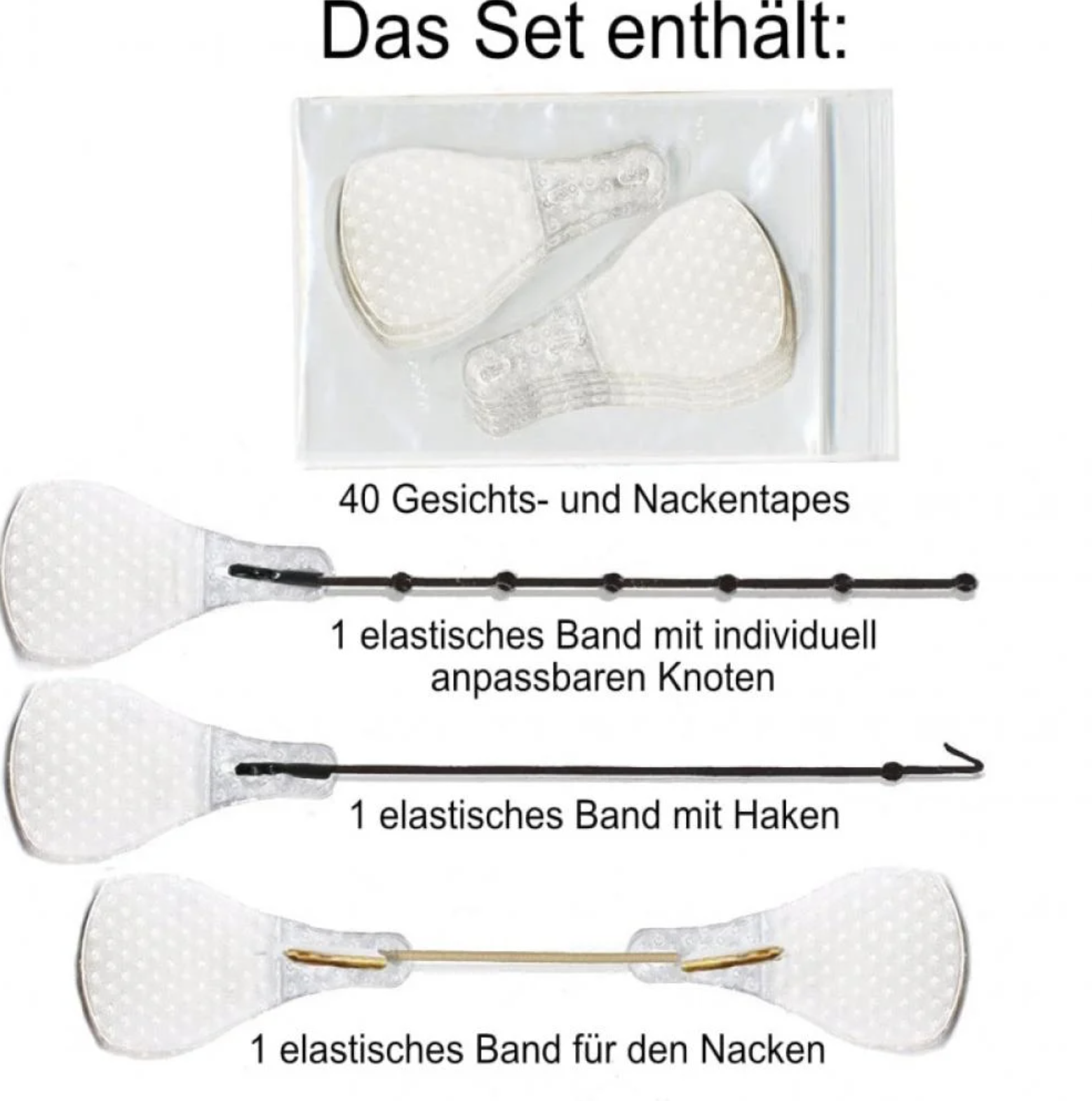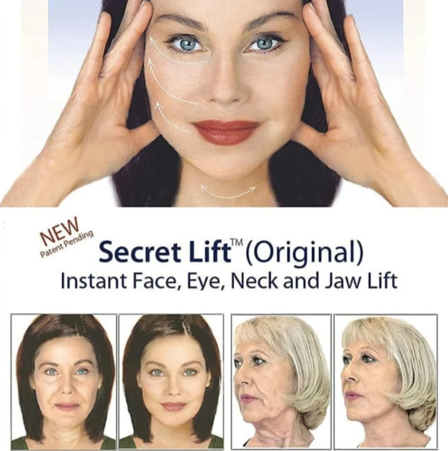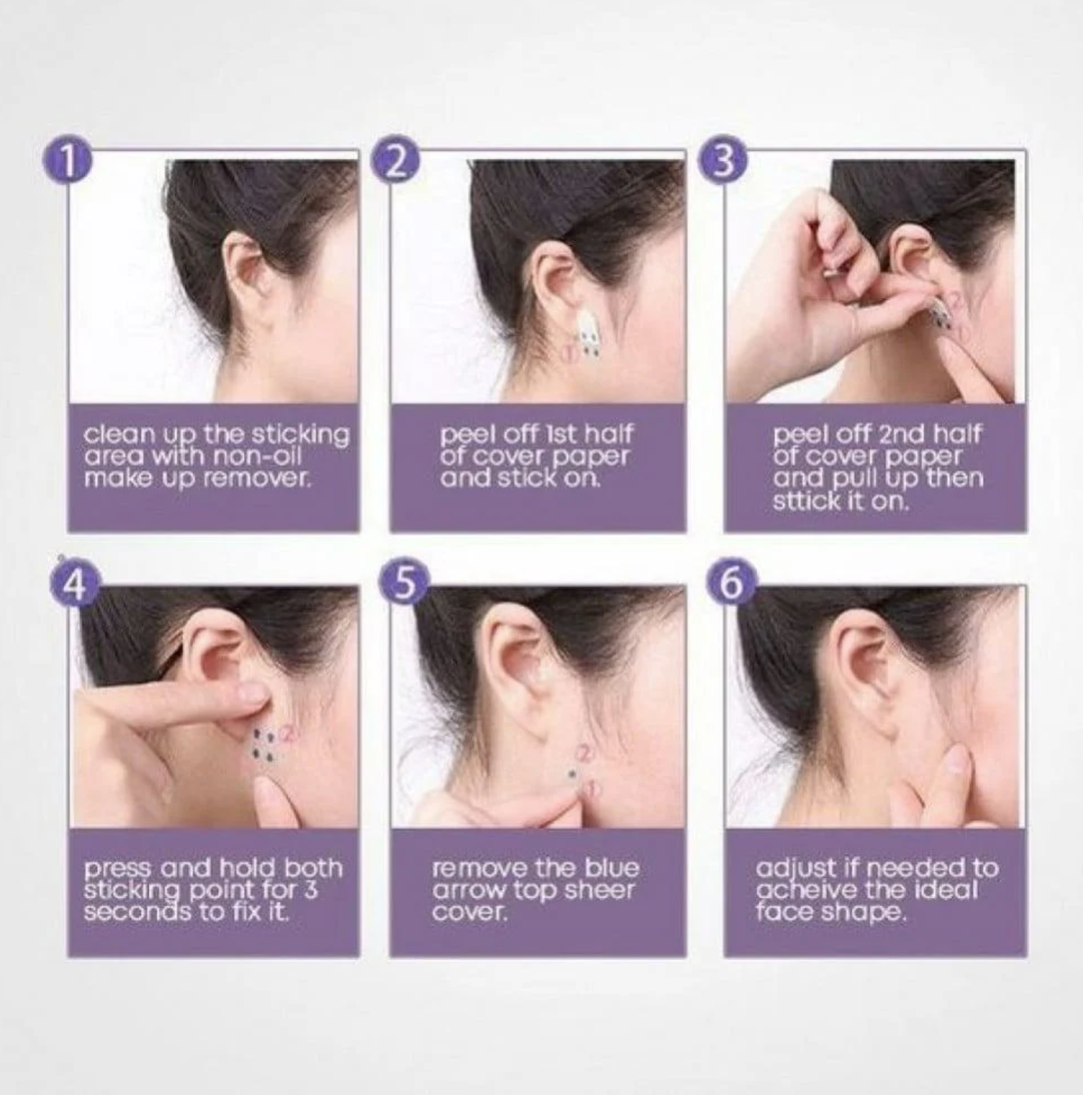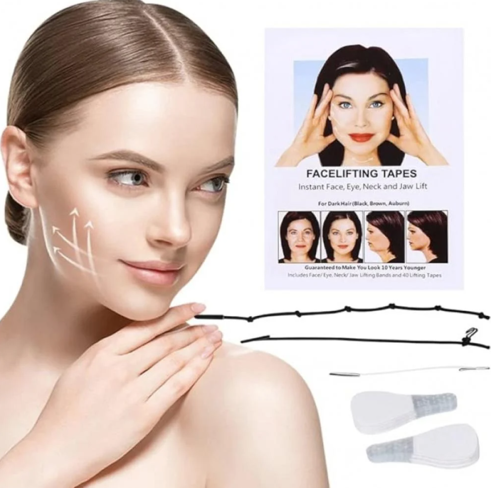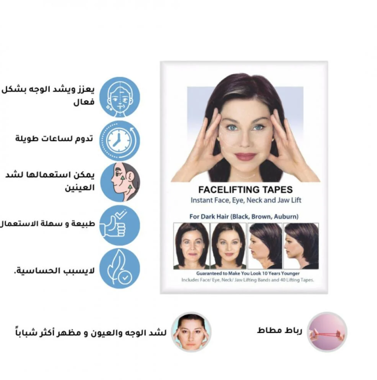 النتيجه تظهر خلال ثواني معدوده، اللصقات ثابته بمكانها لساعات طويله. مع هذه اللصقات يمكنك الأن رفع العين من جهه الحواجب لتصنعي سحبه للعين والحواجب . او الرفع من جهه الخدود لتحديدها . او لشد الرقبه ومنطقة الفك على شكل فك تكساس. يمكن اخفاء الخيوط داخل الشعر، تعتبر حل مؤقت افضل من الأبر، وكانت تستخدم قديما بكثره من قبل نجوم هوليود. تحتوي العلبه على 40 لصقه.
